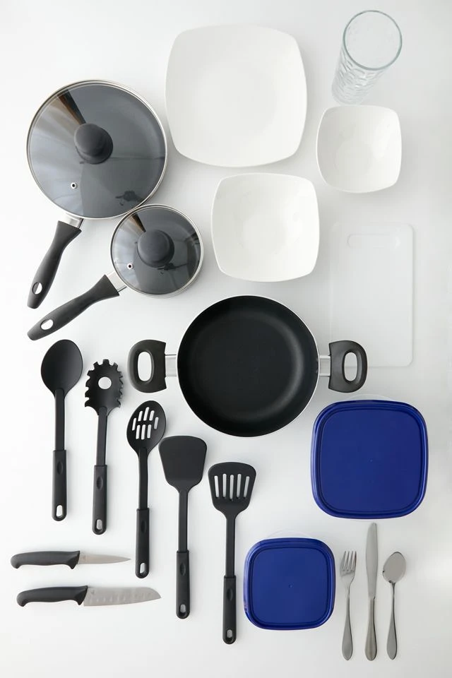 Prepare for your next gathering with this dinner set equipped with all your dining essentials. Features multi-colored rings around the rims of the mugs, plates and bowls and colorful handled cutlery that creates a retro look we love.