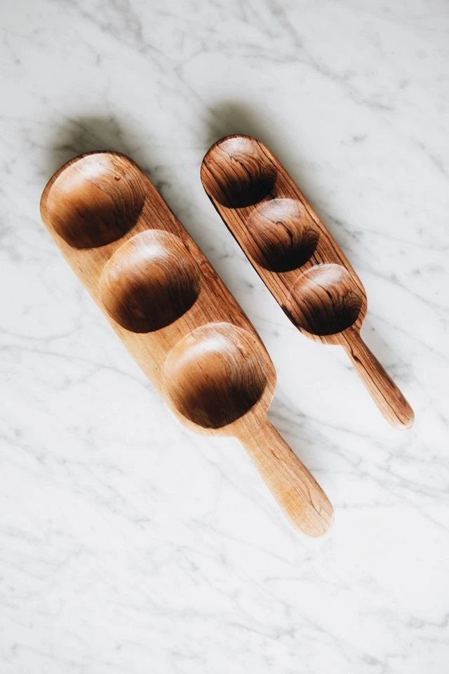 Handcrafted by expert Kamba wood carvers in Kenya from heavy, dense and beautifully grained wild olive wood native to East Africa known for its striking grain patterns and durability. Each tray features three wells for condiments, spices, sweets and more.