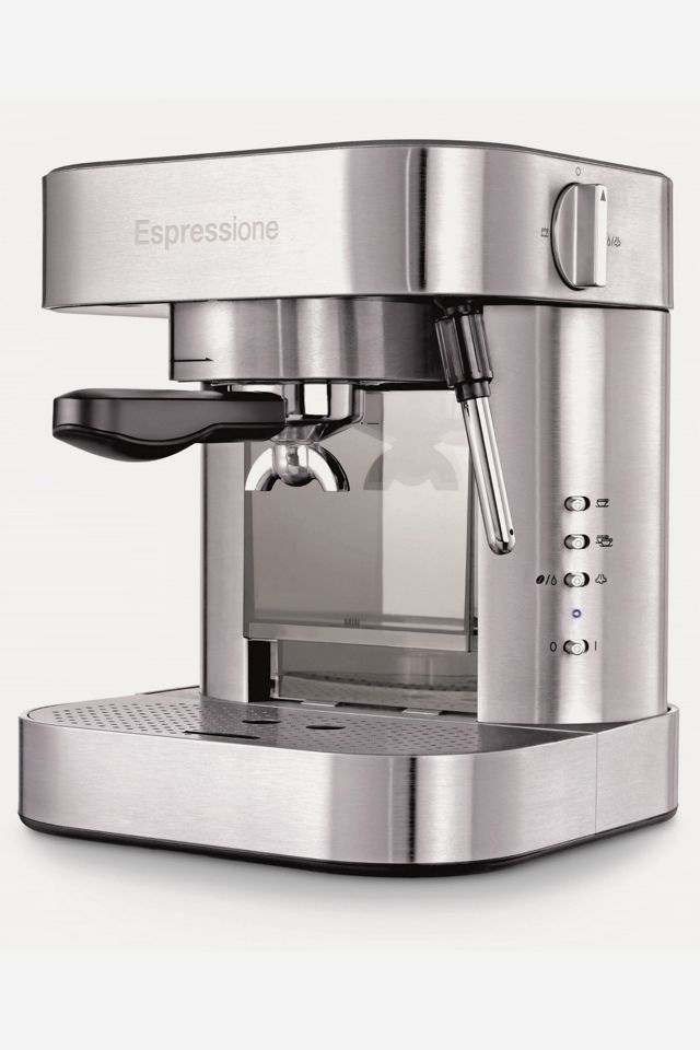 Full body stainless steel 19-bar pump espresso machine designed in Switzerland. Outfitted with great features to make your brewing experience easy and produce flawless single and double espressos with perfect crema, cappuccinos, and lattes. Features include a height adjustable pop up drip tray to let you know when it is full, programmable espresso shot sizes, and easy access to the water reservoir. Incorporated thermo block heating system ensures an ideal, constant temperature without delays. Powerful, easy to use steam nozzle to froth milk, prepare delicious cappuccinos or lattes; and the hot water function used for hot tea. Convenient design with removable frontal water tank and removable drip tray for easy clean up. Heating grid on top to keep the cups warm. Includes a double sided tool of a tamper and spoon, two filter baskets (1 and 2 cup portion).