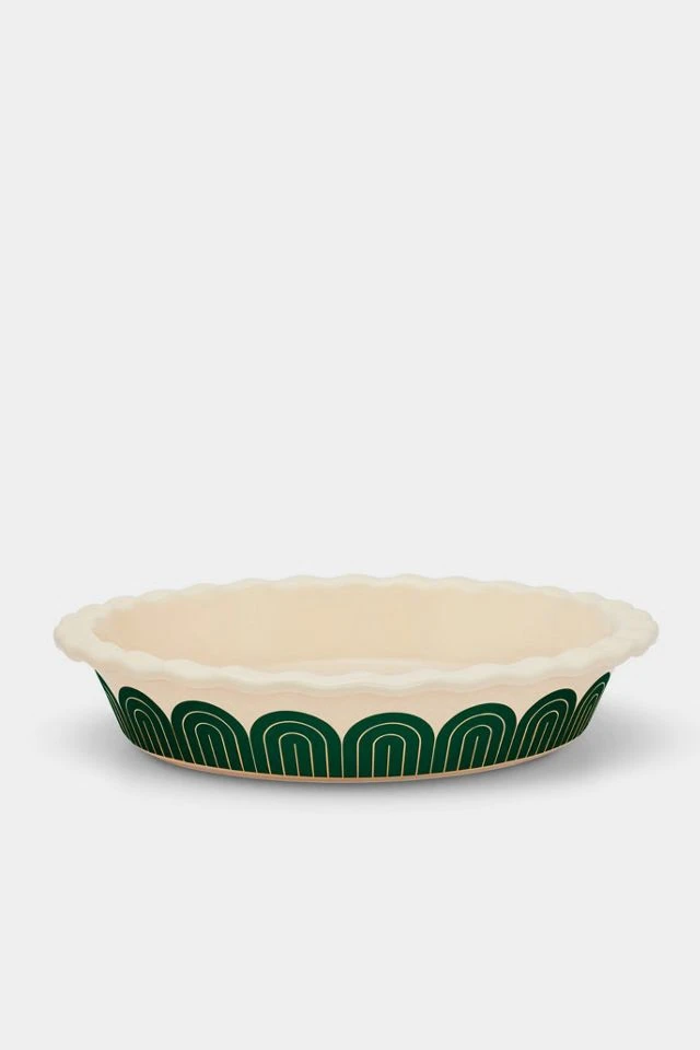 Our 10-inch ceramic pie dish looks as cute as it sounds. The wide, wavy rim will help guide your crust crimping, turning amateur bakers into all-stars. Plus, it distributes heat evenly and consistently produces golden-brown crusts.