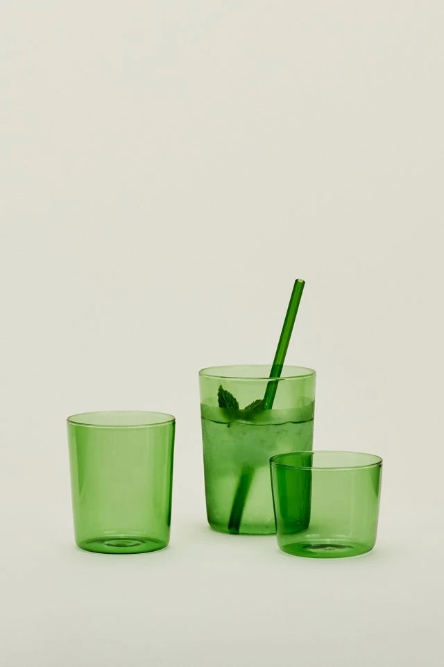 Set of 4. Holds 6, 12, or 20 oz of your morning OJ, dinner water, or evening vino, plus they’re stackable, so you can clear some shelf space. Colorful + hinting at retro, but with super modern lines. Match (or mix!) between sizes, bottoms up!