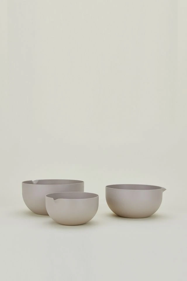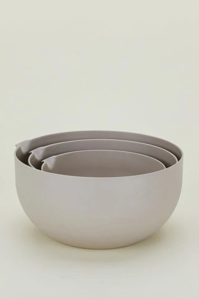Set of 3 recycled bamboo fiber mixing bowls. High, straight sides and a generous pouring spout for mess-free, worry-free culinary creativity. It’s cool to care; recycled materials are all the rage + the earth will thank you, too. For every -ing: marinating, mixing, whipping, combining, enjoying.