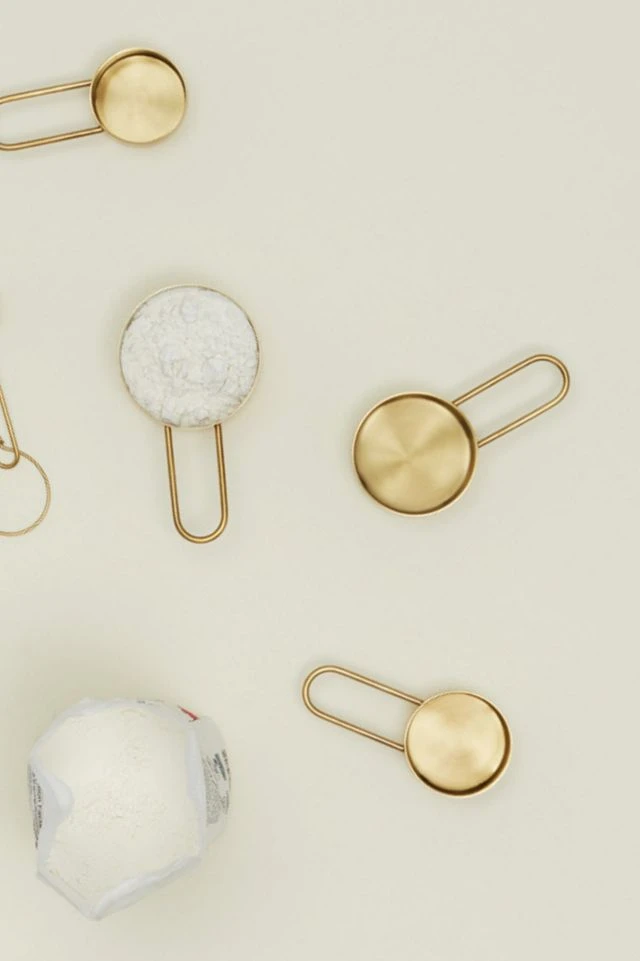 Sleek and shiny and handy. Wide loop handle is pleasant in the hand – and useful for hanging up, too. Or keep ’em stashed in their cotton pouch, out of the way. Sibling set to our Simple Brass Measuring Spoons.