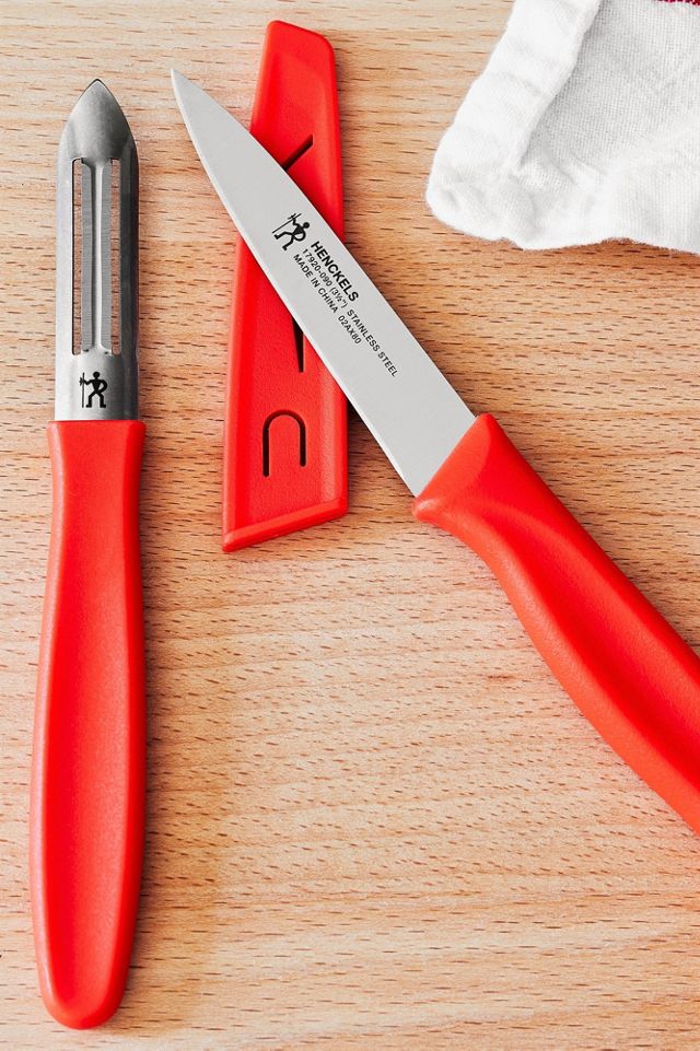 Paring knives, peelers, and utility knives are the tools you reach for every time you prep. Since 1895, Henckels has been making high quality essential kitchen tools like these workhorses of the kitchen. Thanks to their durable high carbon stainless steel composition, these single-piece, precision-stamped blades are light and excellent for maneuverability. Experience ultimate sharpness with these satin-finish blades. Featuring colorful polypropylene handles, these lightweight, versatile tools provide an ergonomic grip for fatigue-free cutting. The Prep set features a handy peeler with a built-in potato eyer along with a paring knife.