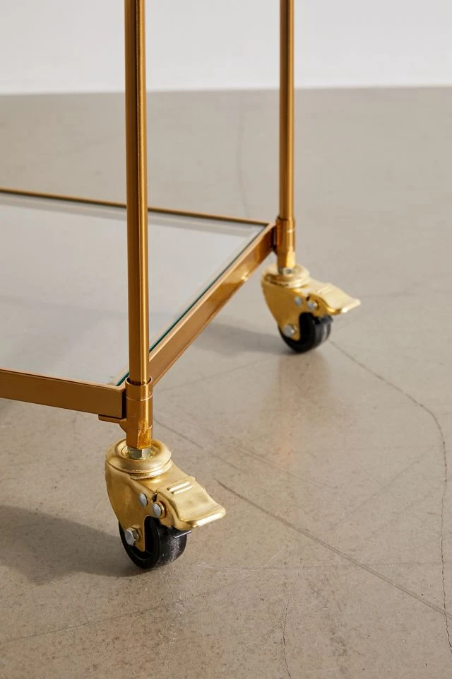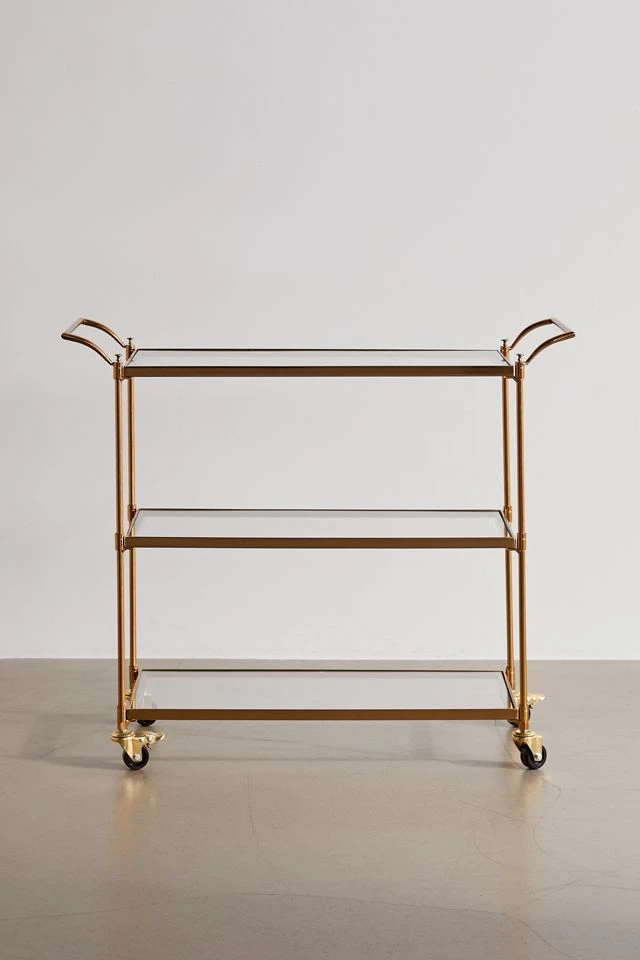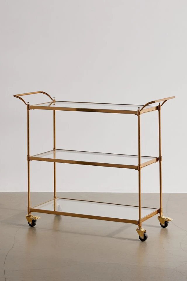 Sleek brass-toned bar cart in a versatile silhouette complete with removable wheels. Three roomy fixed shelves allow you to stock your bar or store your favorite go-to supplies in any space.