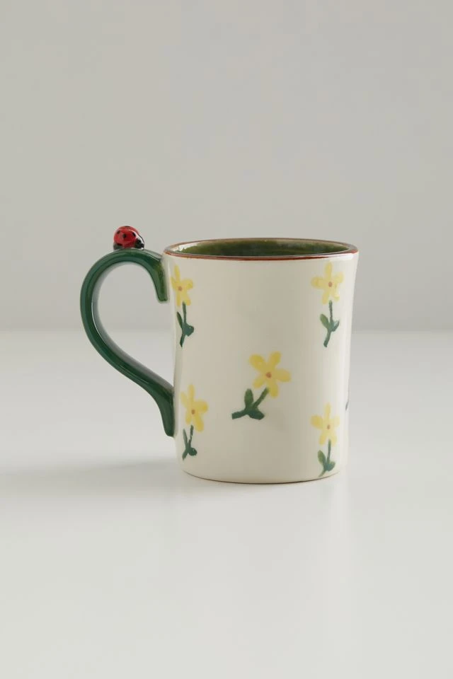 Enjoy your next cup of coffee out of this kitschy mug featuring an all-over sunflower motif and a little ladybug figurine on the handle.