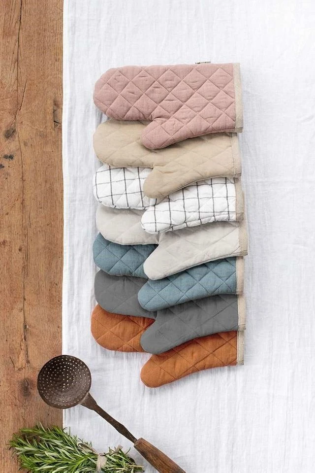 Linen oven mitt (oven glove) available in various colors. Quilted on the outside with heat-insulating padding inside, this oven mitt will protect your hand and forearm from heat. Sturdy and easy to care for, its irreplaceable in the kitchen.