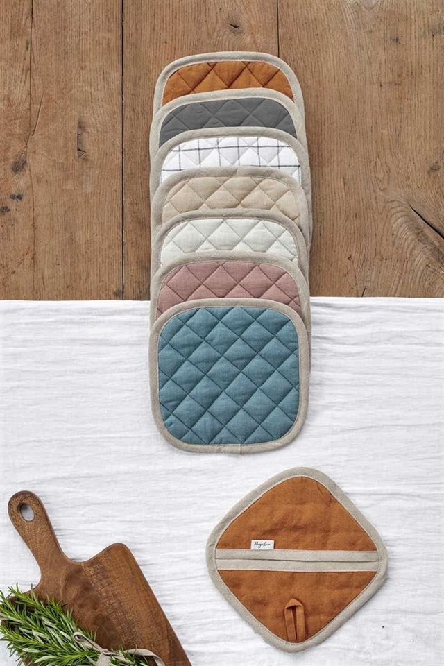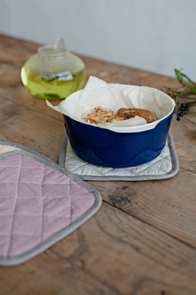 Linen pot-holder available in various colors. Quilted on the outside with heat-insulating padding inside, this pot-holder will protect your fingers and palm from the heat. Sturdy and easy to care for, it’s irreplaceable in the kitchen.