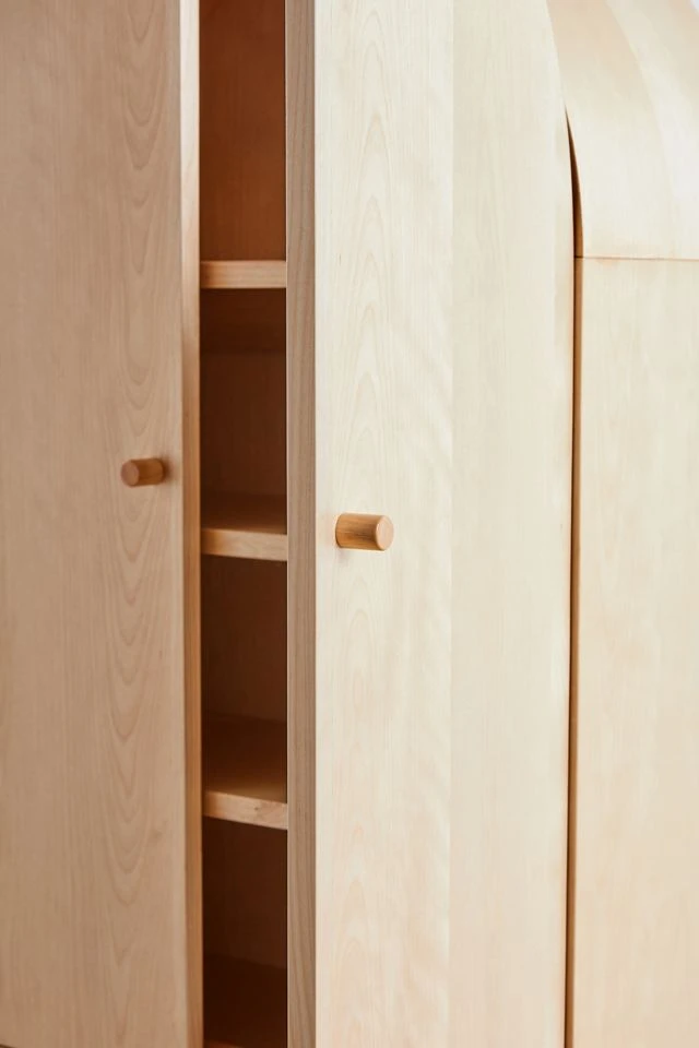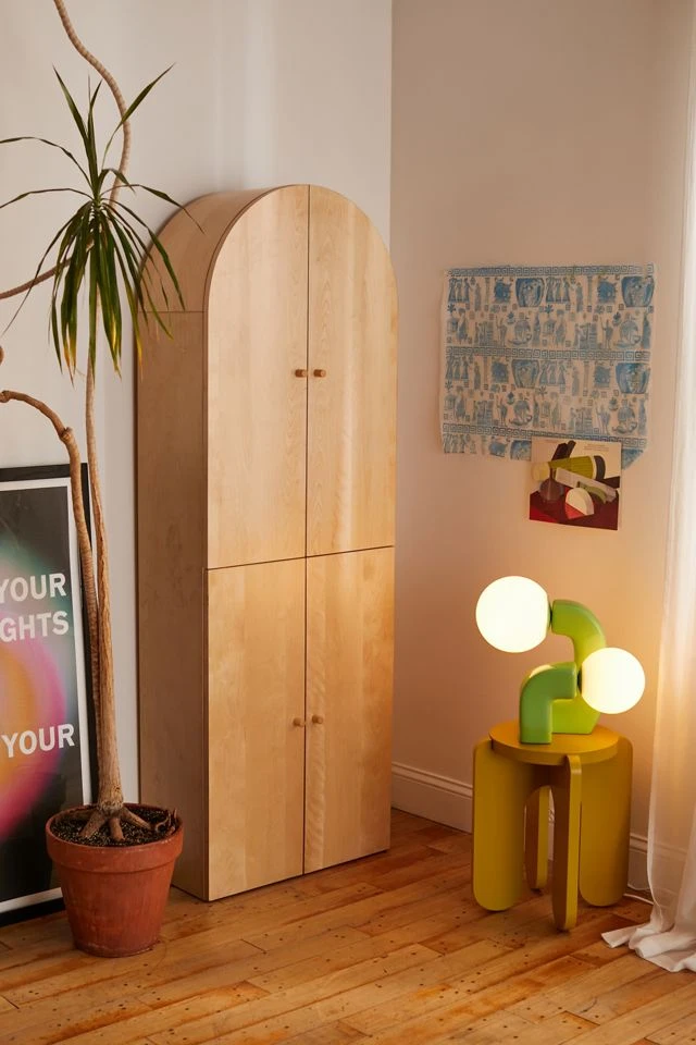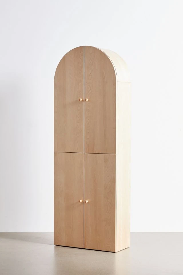 Tall wooden pantry cabinet, featuring an arching frame with two doors topped with peg knobs. Inside are seven storage shelves for organizing so many essentials. Cabinet comes fully assembled. Available exclusively at Urban Outfitters.