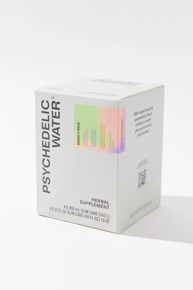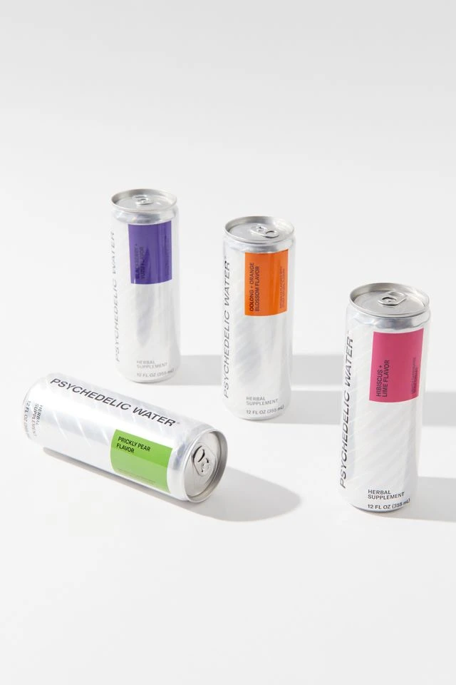 Pack of four herbal supplement drinks from Psychedelic Water, made using kavalactones, damiana leaf extracts and green tea.
