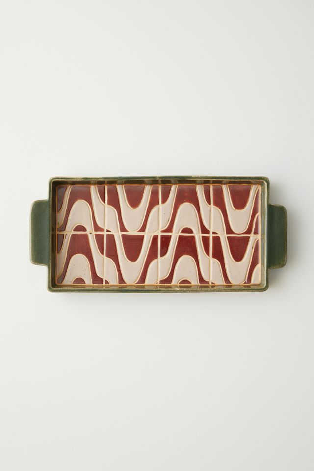Perfect for serving small treats or storing your produce, this serving tray adds an artful accent to your space. This handled tray features a tiled interior with a retro wavy design. Available exclusively at Urban Outfitters.