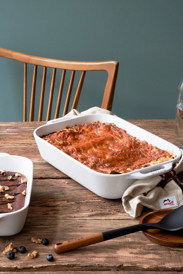 Staub rectangular stoneware bakers gently retain heat and won’t absorb moisture, producing a delicious result for all of your favorite dishes. The stackable 2-pack rectangular dishes measure 7.5″ x 6″ and 10.5″ x 7.5″ and are perfect for lasagna, casseroles, desserts, as well as roasted meats and vegetables, and transition beautifully from oven to table.