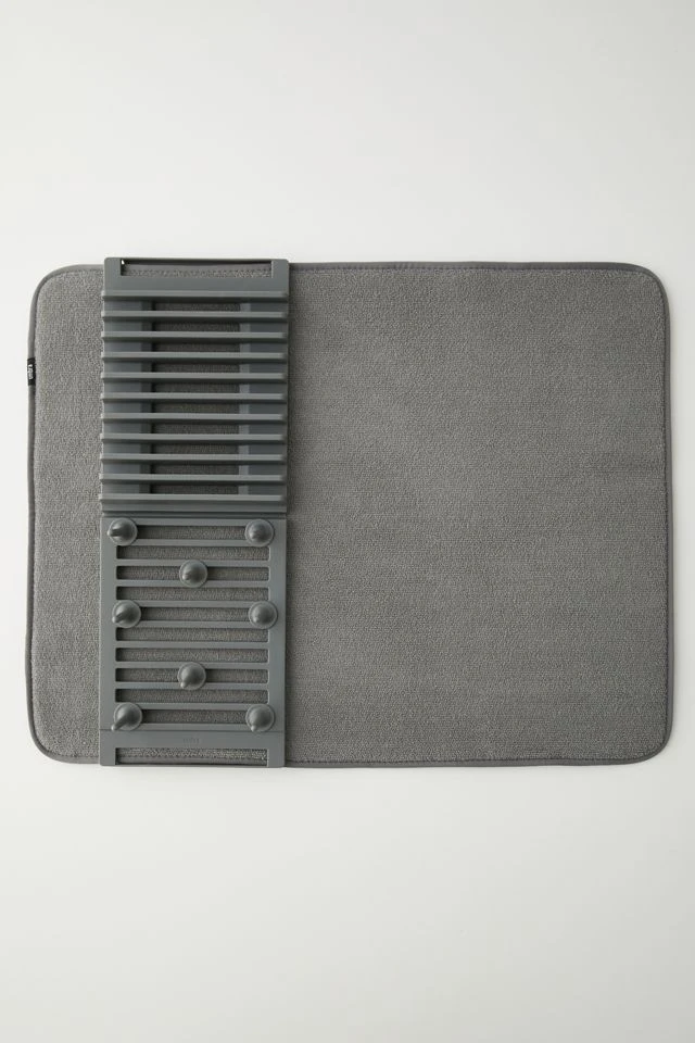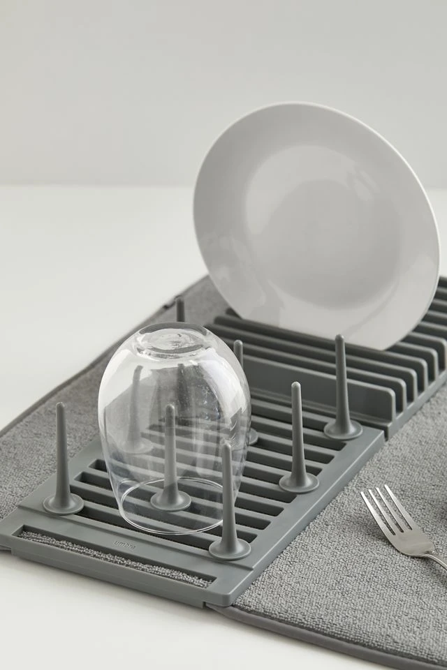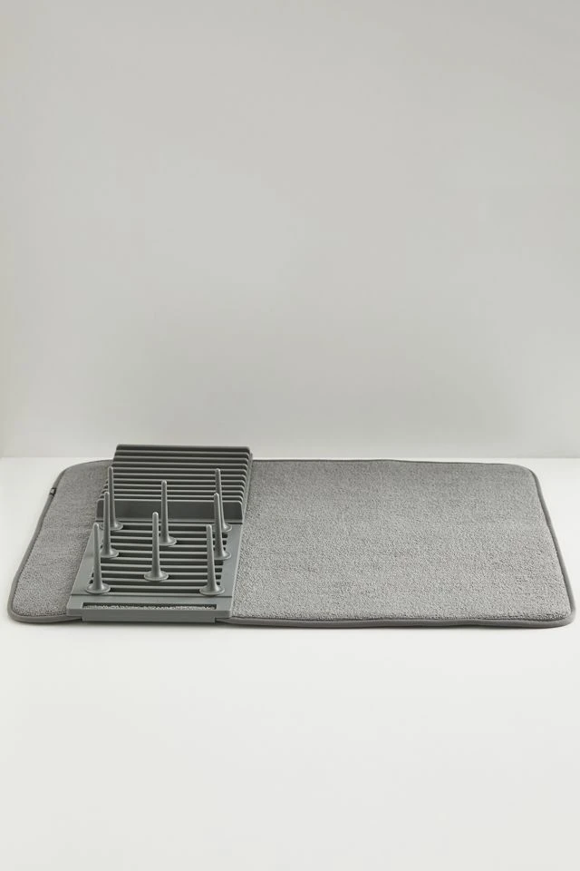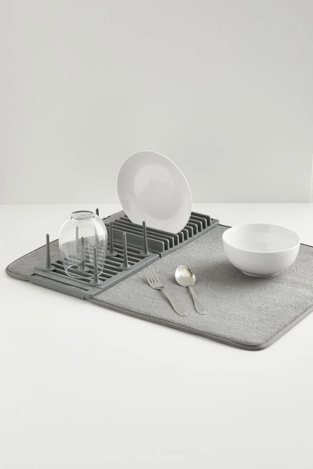 Drip dry your dishes with this modern-inspired dishrack featuring slats to keep your dishes upright and pegs to hold your drinking glasses in place. Complete with an absorbent microfiber mat to help keep your countertops dry. Drying rack neatly folds to store when not in use.