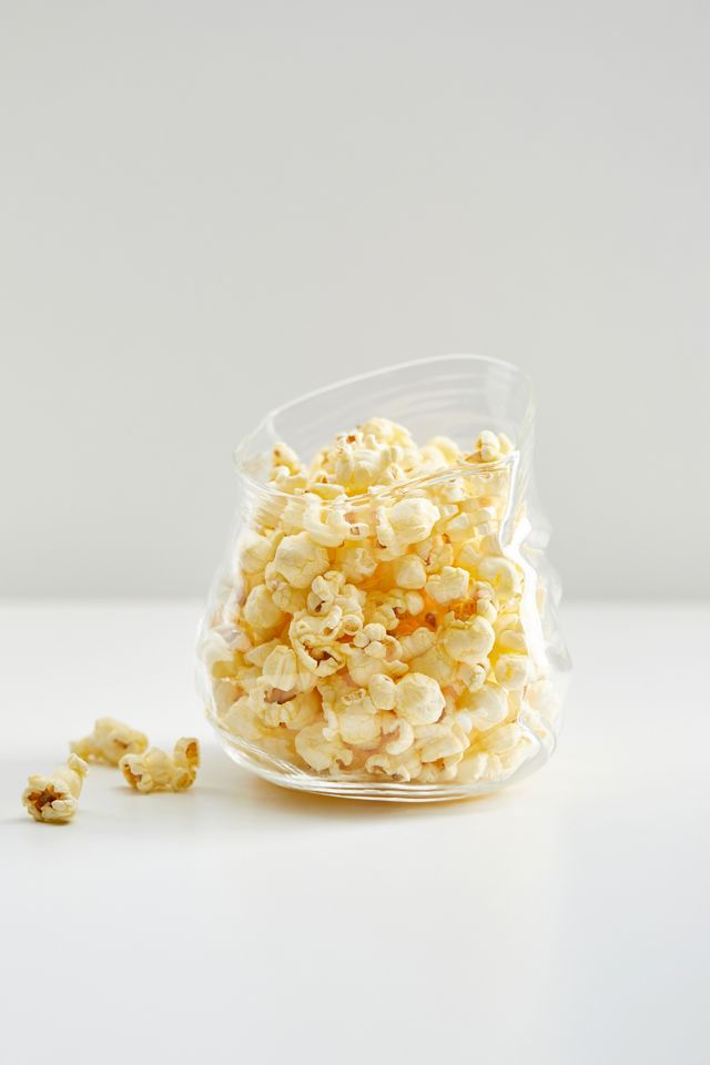 Enjoy tasty snacks in style with this glass bowl sculpted like a crinkled bag. Perfect for serving popcorn, berries and more.