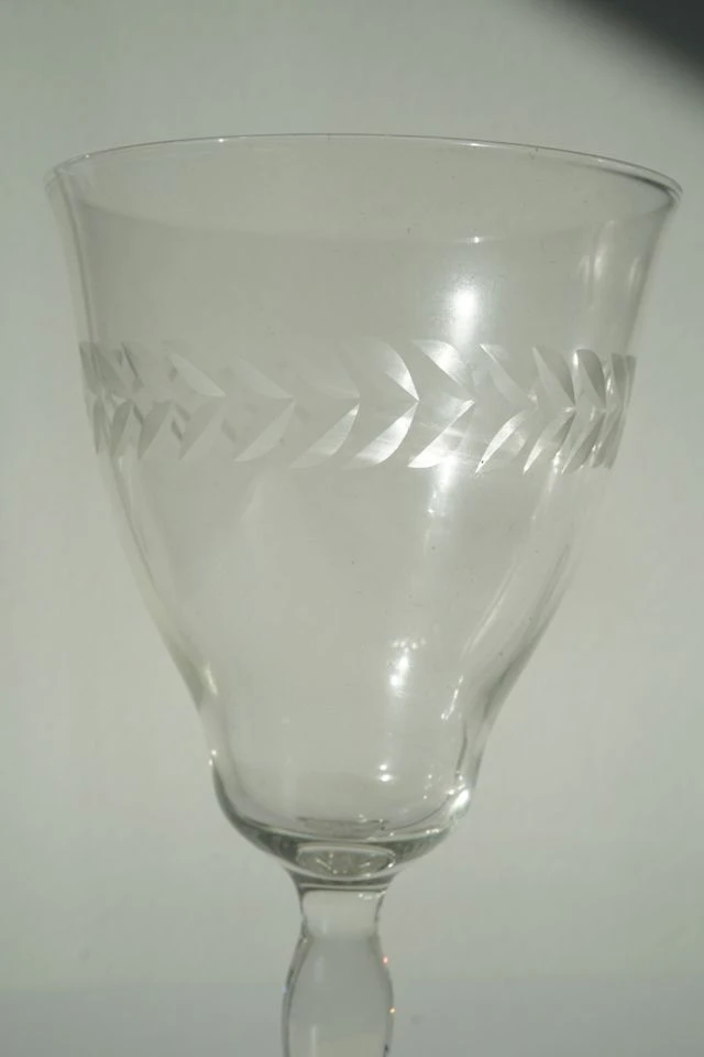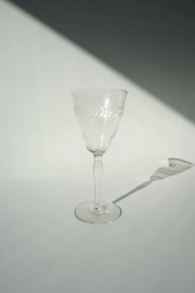 Wind down with this vintage wine glass. This wine glass is decorated in a frosted etched leaf pattern that wraps around the top of the glass. This piece will add the perfect ethereal touch to any bar cart.