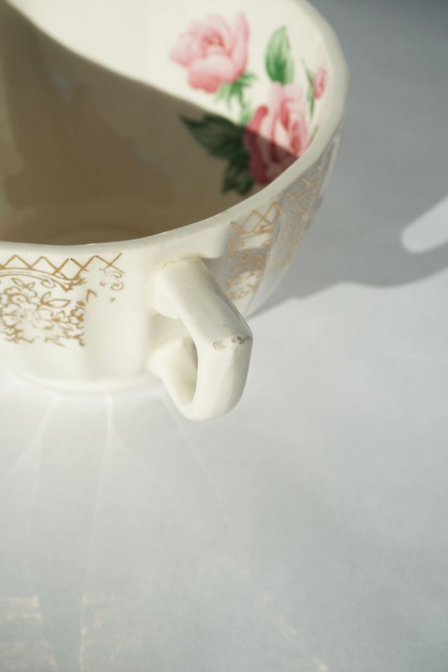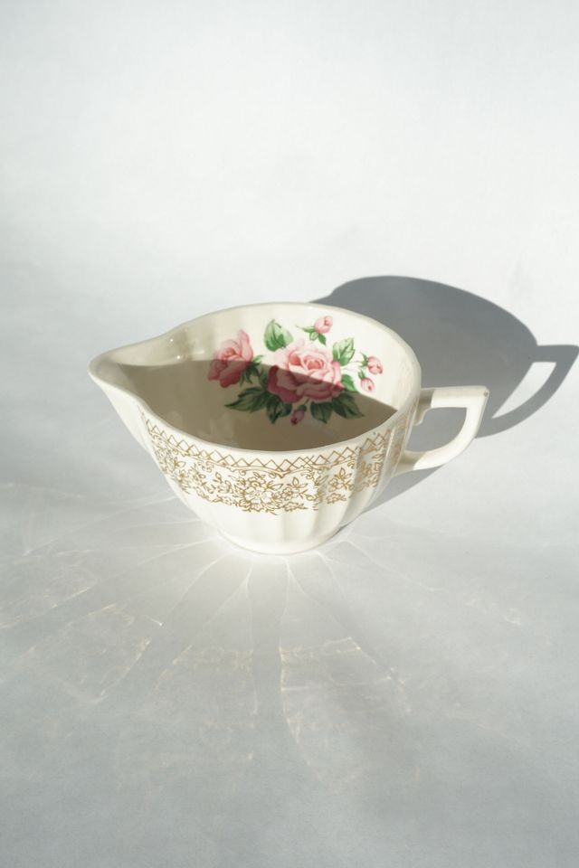 This vintage creamer is decorated in a gold leaf floral pattern along the edge with a vibrant pink rose design on the inside of the bowl. A delicate handle and a textured pattern finish the design of this piece. Please note some small chips on the handle.