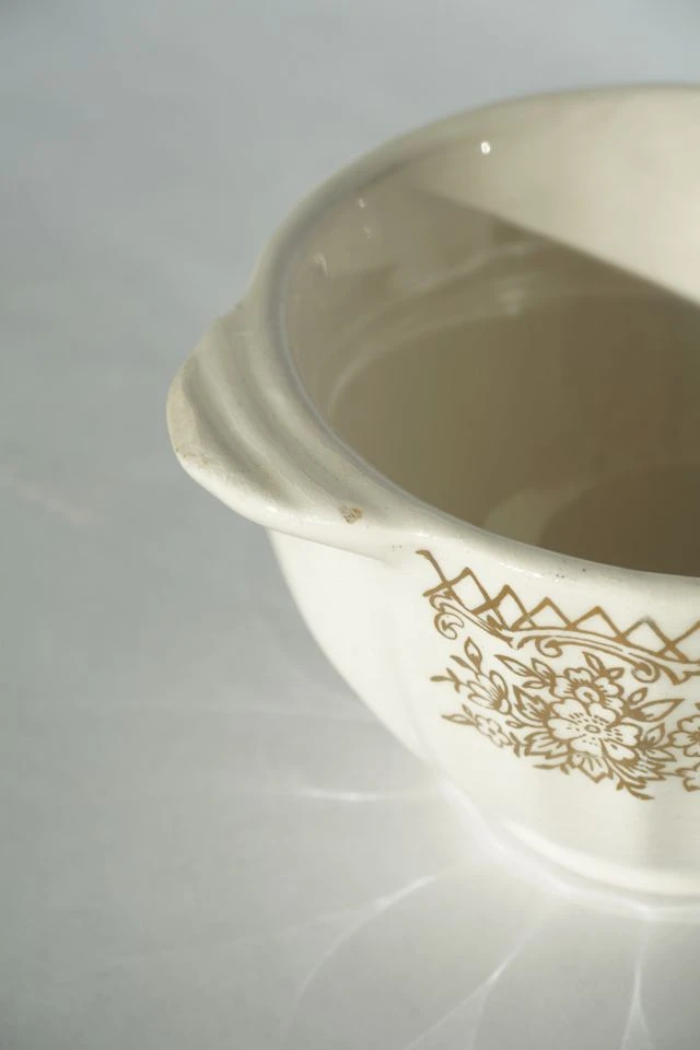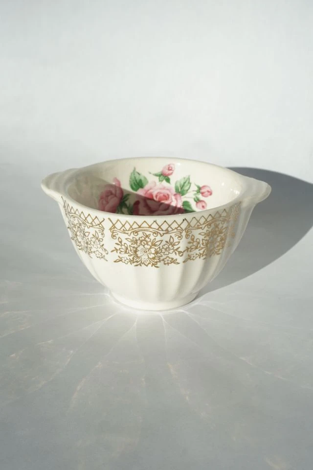 This vintage sugar jar is decorated in a gold leaf floral pattern along the edge with a vibrant pink rose design on the inside of the bowl. Handled sides and a textured pattern finish the design of this piece. Please note some small chips on the handle.