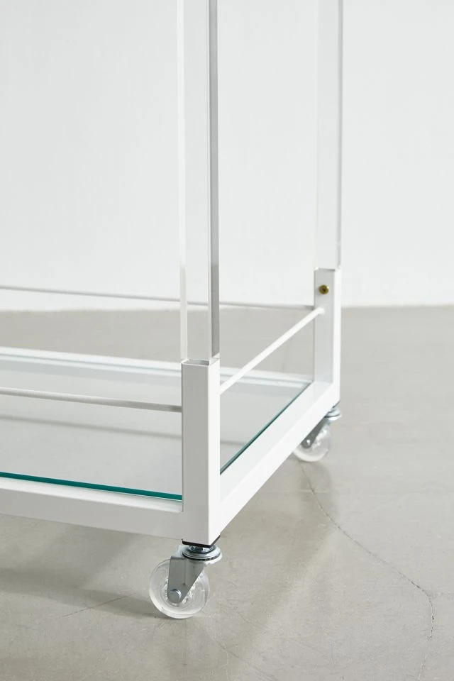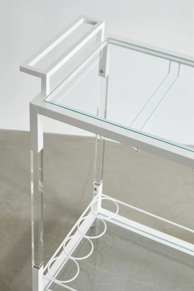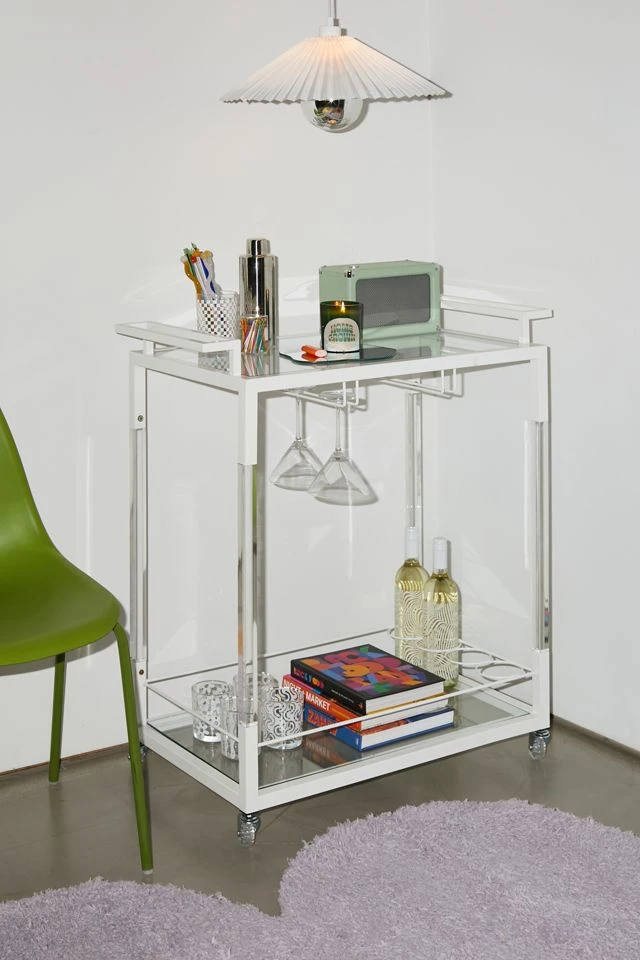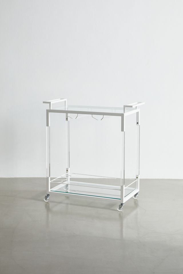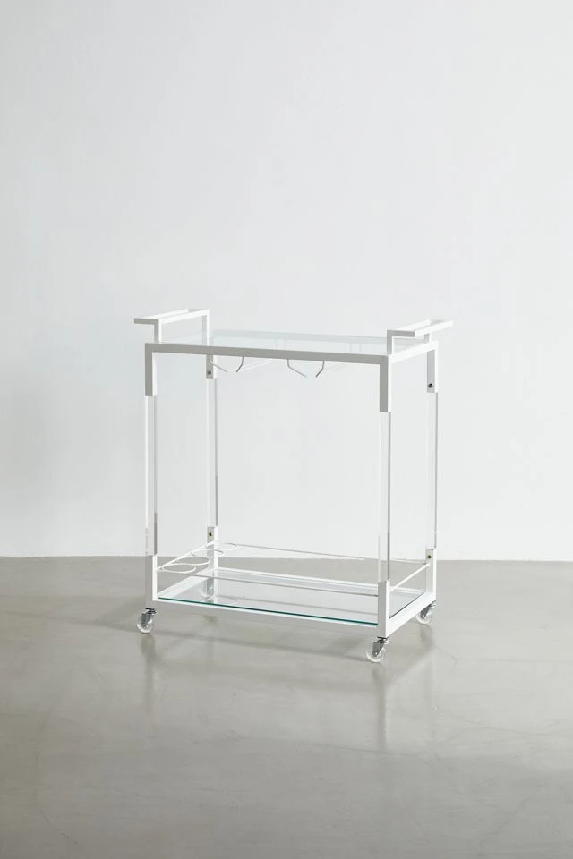 Add a retro feel to your at-home bar with this storage cart featuring two glass shelves framed by iron and clear acrylic. Perfect for a stocked bar or for easy storage in your space. Equipped with wheels at the base so you can move your essentials throughout your space.
